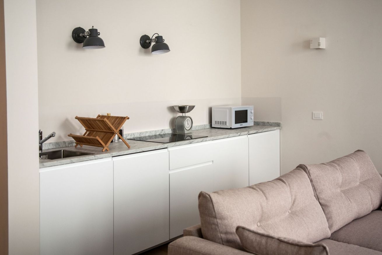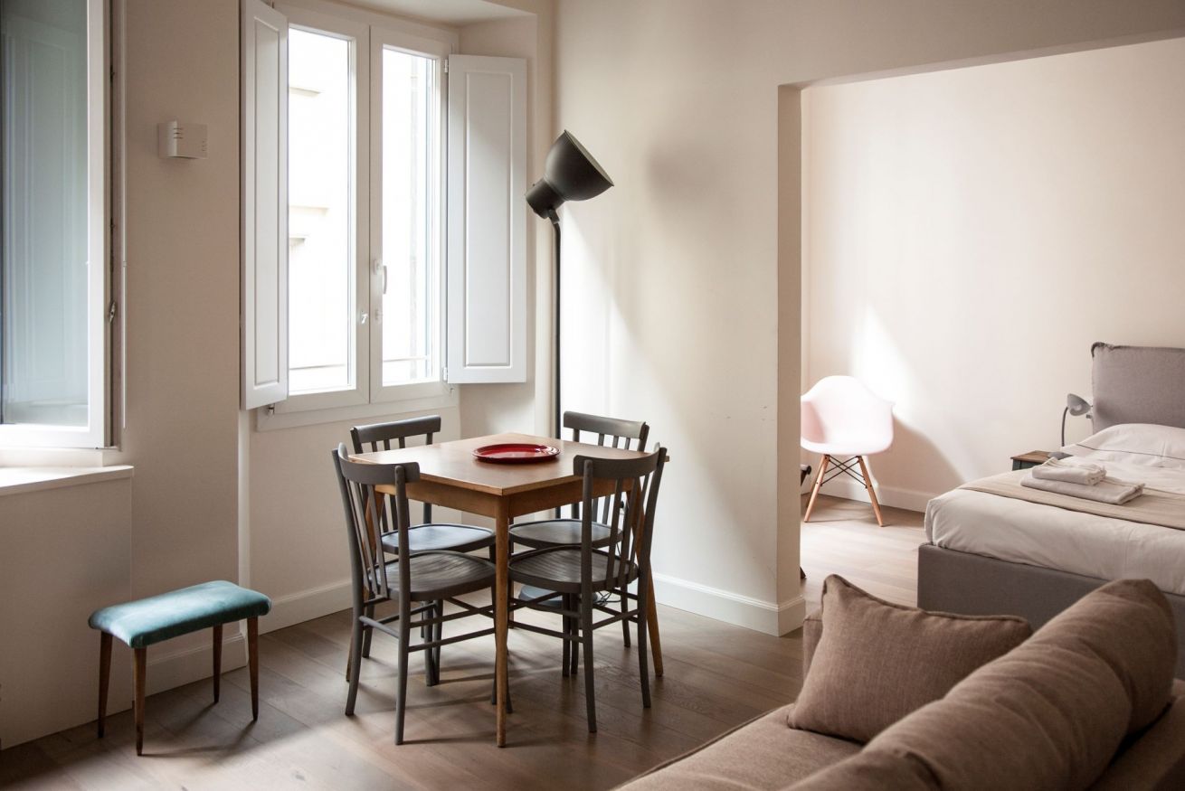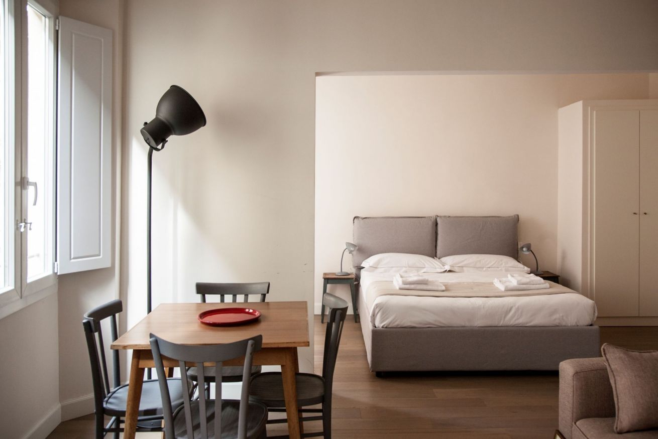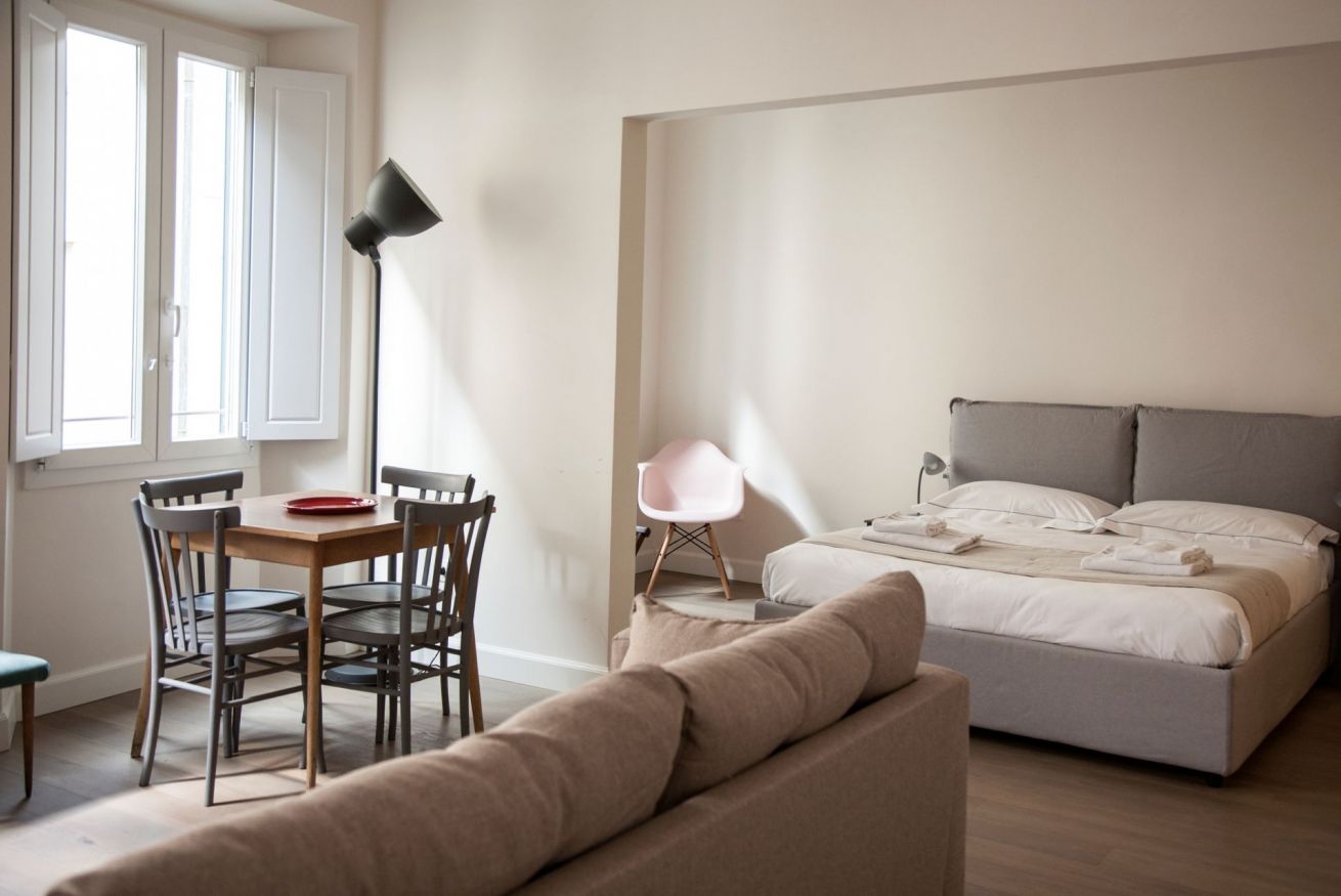 Macci è un open space, nello stesso ambiente convivono in armonia il salotto, dove è presente un comodo divano letto per ospitare una terza persona, la cucina e la camera da letto. Il bagno è ampio dotato di una doccia spaziosa. L’arredo è molto rilassante e piacevole e gli spazi sono luminosi grazie alle tre grandi finestre che affacciano sulla caratteristica via Pietrapiana.